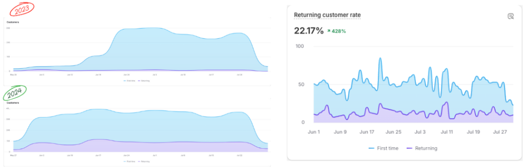 - הגברת שיעור הלקוחות החוזרות ב-428%: שיפור מטורף של הביצועים. השתמשנו באותם הכלים שהיו למותג בשנת 2023, ללא צורך בהגדלת ההוצאות על מערכות חדשות ובשנת 2024, 1 מתוך 4 לקוחות חזרה לרכישה 1 נוספת לפחות, חלקן גם ליותר.